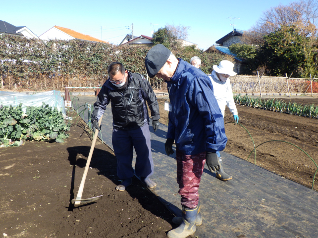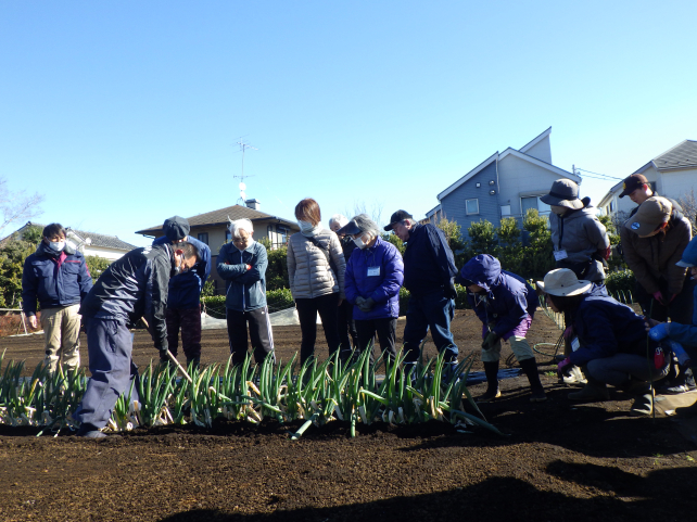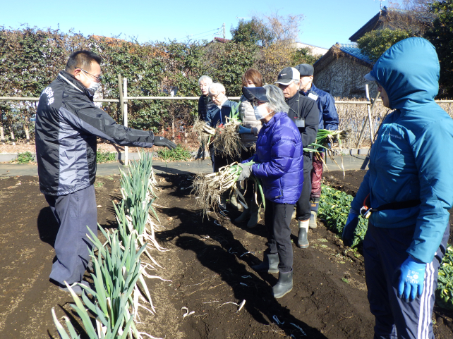 数日前に降った雨のおかげで圃場全体に降りた霜が溶けるころ、いよいよ外にでて久しぶりの農作業です。今日は杉並区の農家さん2名も参加してくださったので、まずは農家さんにネギの土寄せの仕方のお手本を見せてもらいます。今日は圃場の土が重かったので実技はできませんでしたが、農家さんへの質問が相次ぎ、色々なことを教えていただきました。半分は抜いて持って帰り、土寄せしたものは3月に収穫し、その違いを比較します。