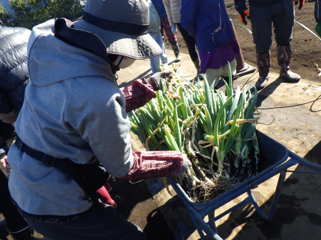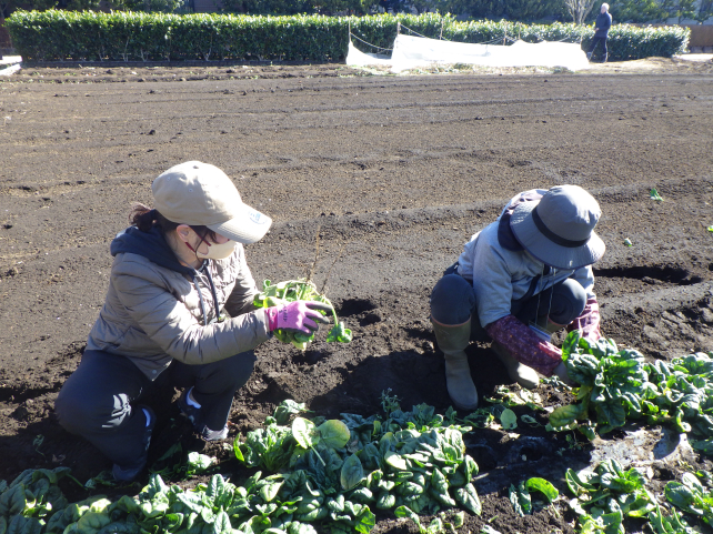 まずは寒ちぢみホウレンソウの収穫です。この時期のホウレンソウは寒さに負けないように太い根が地面の深くまで張っているので、根元を持って慎重に抜かないと葉がちぎれてしまいます。そんなことを実感しながらみなさん慎重に収穫していきました。