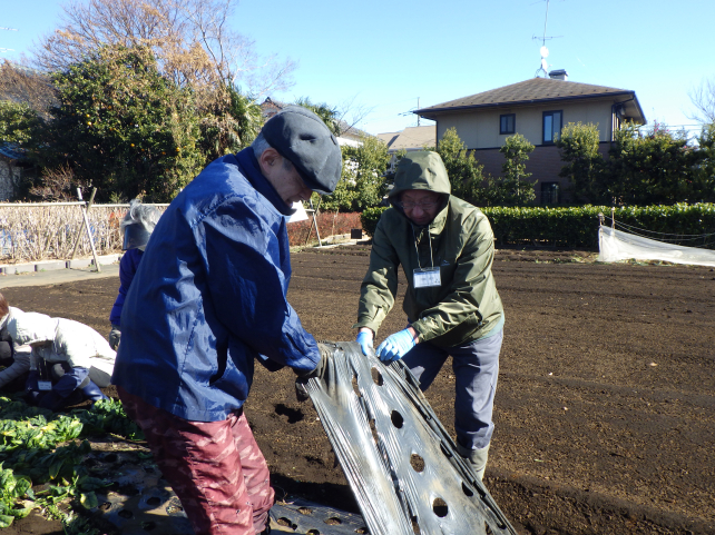 そしてスティックセニョールも収穫。また収穫だけでなく、野菜を抜いた後の除草やマルチの片付けなど、畑の後始末もみなさん慣れた手つきでチームワーク良く行っていきます。合間には農家さんと受講生が交流する姿も見られました。