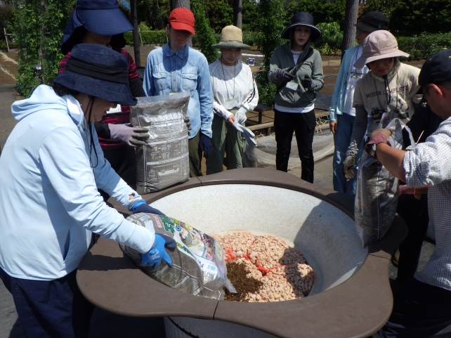 コンテナに新しい培養土を入れて、来週の種まきの準備をしました。