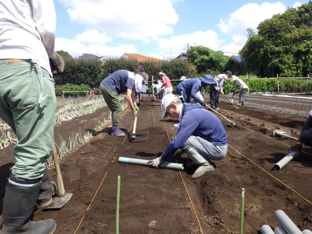 今の時期は、秋冬野菜の種まきと苗の植え付けが一気に始まります。そこで、今回も苗を植えるための畝を立てて、マルチを張るところからスタート。前回もやったので、少しずつコツを覚えてきて、前回より長い畝にも関わらず、手際よく上手に畝立てをすることができました。