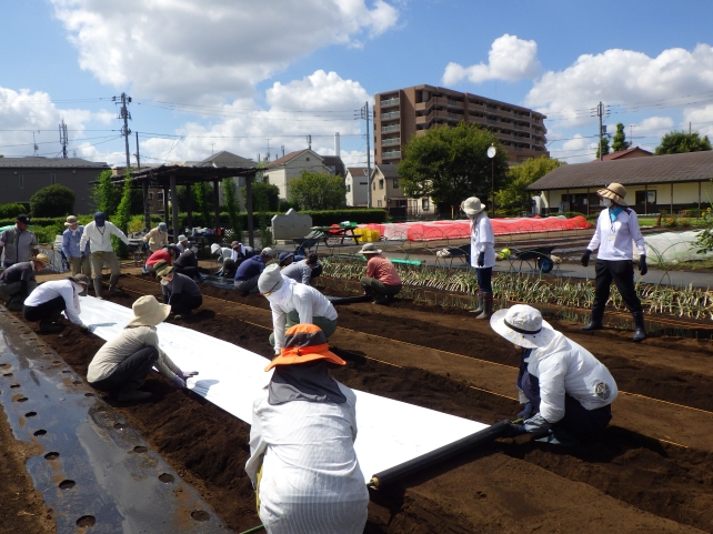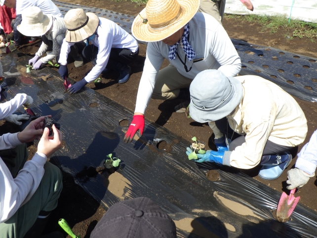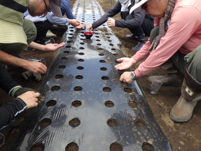 草の防止や保温、保湿のために便利なマルチというビニールのシートが畑には欠かせませんが、その色や素材などによって期待できる効果が少しずつ違うことなども学びながら、この畝はこのマルチ、次は別のマルチと、色々なマルチを張る体験もできたと思います。