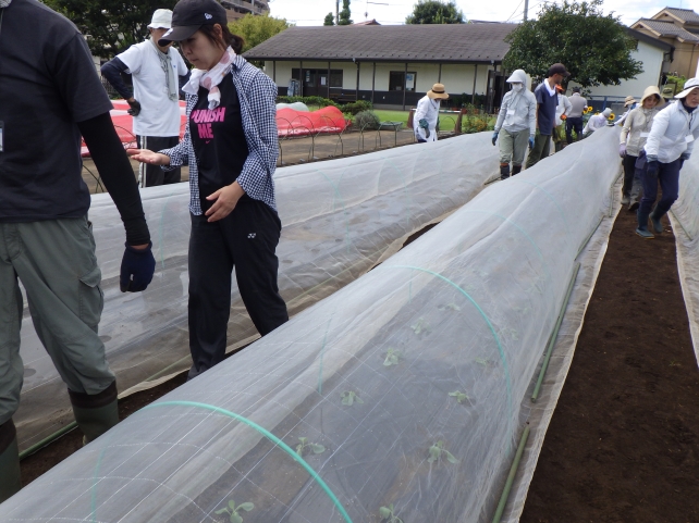 最後は種まきです。まず大き目な種のダイコンから。春にエダマメやトウモロコシの種まきをしたときの注意事項を思い出しながら播いていきます。次いでコマツナやカブといった葉物の種まき。こちらは種もかなり小さく種まきする穴もたくさんあるので、より集中力が必要です。みなさん真剣に慎重に種をまいていきました。どちらも発芽してから虫にやられないように最後に防虫ネットをかけて、今日の作業はおしまい。