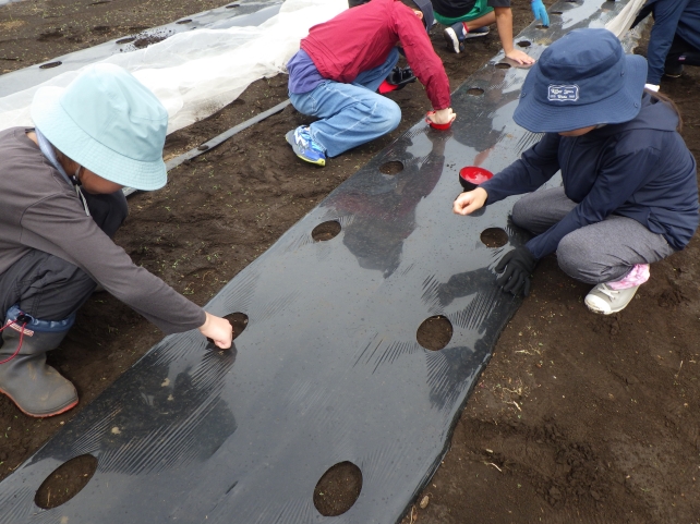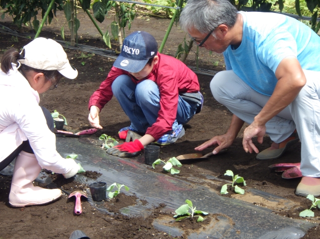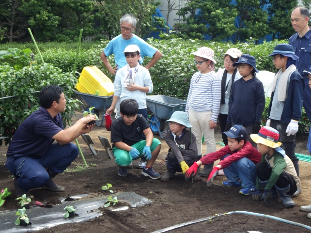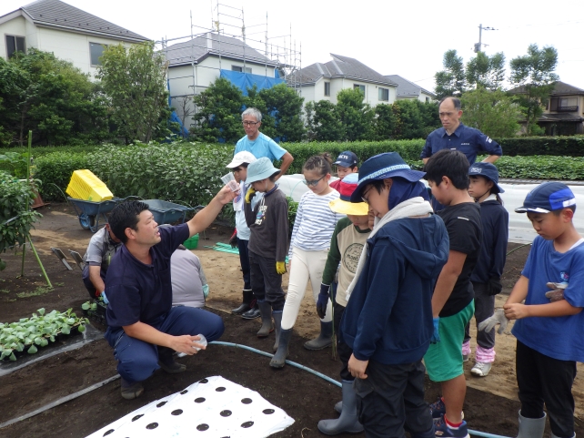 時々太陽が雲から顔を出すと一気に熱くなるので、こまめな休憩を挟みながら、次は野菜の苗の植え付けにチャレンジです。まだとても小さいキャベツとブロッコリーの苗。これから育つのに大事な幹を折らないように気をつけて植えてみてね。でも難しいから失敗しても気にしないでと説明を受けての植え付けでしたが、なんと誰も失敗することなく、とても上手に植えることができました。