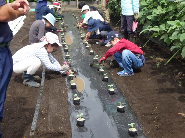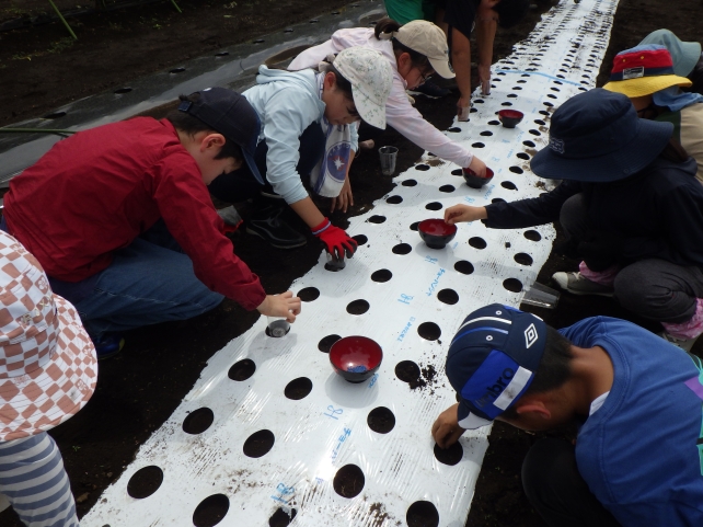 その後は、さっそく畑で農業体験です。まずはダイコンの種まき。プラスティックのコップで種まきをする場所に凹みを作るのですが、連日の豪雨で土が固くなっていて、なかなか苦戦した子もいたようです。でも、ひとり8穴、2種類のダイコンの種を播き終わる頃にはずいぶん慣れてきたようでした。
