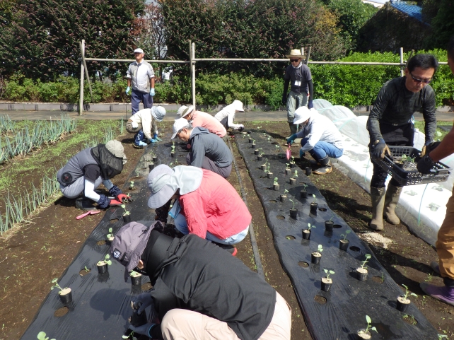 まずは苗の植え付け。先日畝立てしたこの公園で一番長い畝にブロッコリーや茎ブロッコリーとも呼ばれるスティックセニョールの苗を植えていきます。今までで一番多い数でしたが、みなさん慣れてきたようで、とても順調に植え付けが終わりました。