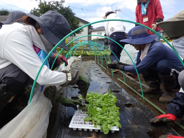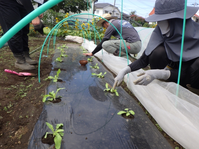 当然、防虫ネットもかけます。こちらも何回も体験してきたので、とくに担当分けをしなくても各自が作業を分担して、手際よくネットをかけることができました。また、まだクワの使い方に慣れない人にコツをつかんだ人が教えてあげる姿も見られ、頼もしいばかりです。