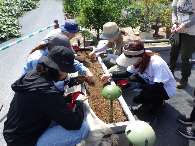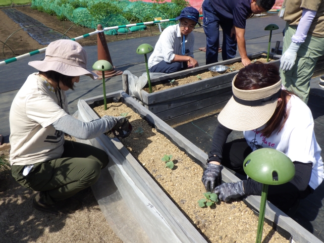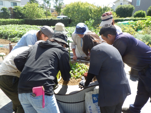 木製のコンテナの植え付けは今日で完成。残っている丸型コンテナに次回種まきをして植え付けは終了となります。間引きや追肥をしながら、この後の作物の成長を見守っていきましょう。
