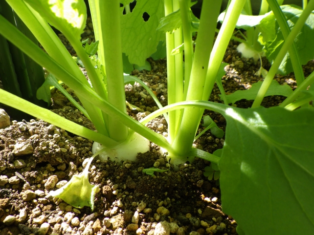 カブ2種類は収穫を兼ねた間引きです。株元に小さなカブがみえてきましたね。