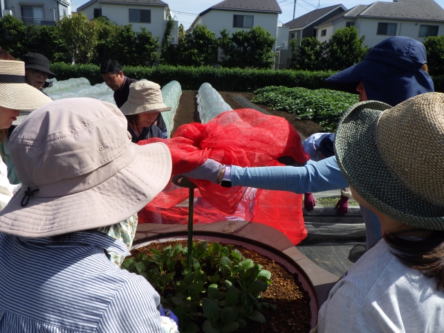 コマツナも間引きをして、虫探し。虫のフンや葉に穴はありますが、なかなか虫の姿をみつけることができません。防虫ネットを皆で協力してかけました。