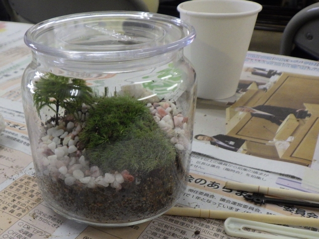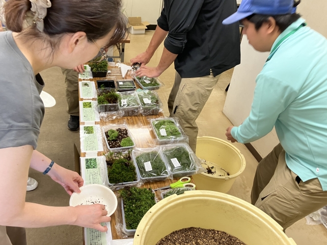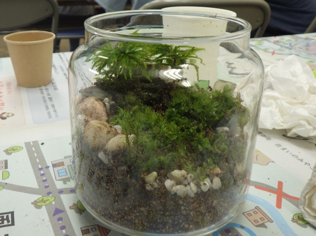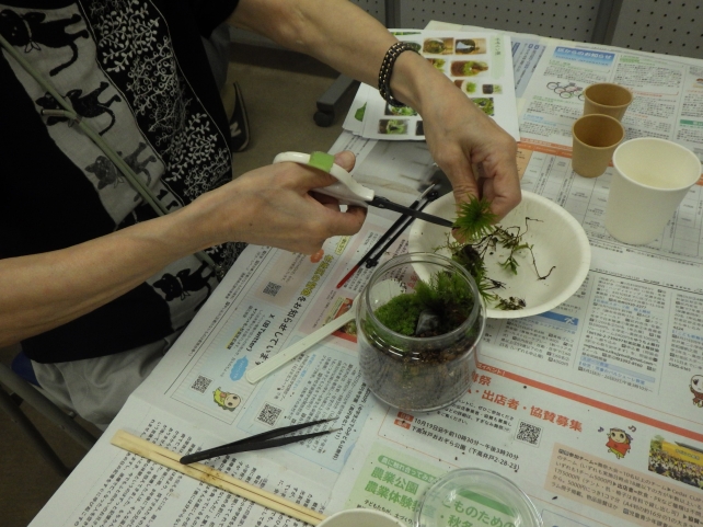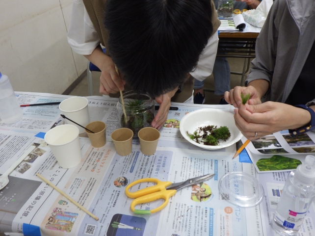 楽しい時間はあっという間に過ぎ、参加された方々からは、「普段見かけないような種類の苔や、景色となる石や砂の種類が豊富で、作っていて楽しい」、「瓶の中でカビが出たり、枯れたりする例も見れて良かった」などの声を頂きました。