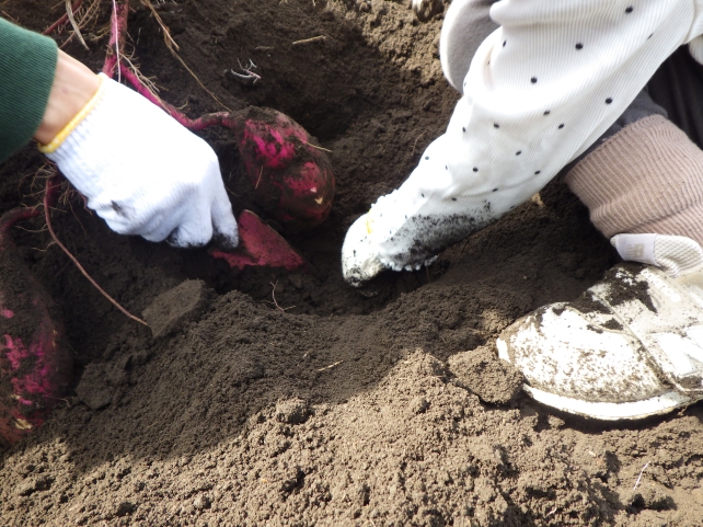 しっかり掘ってから引っ張らないと先が折れてしまいますので、お芋の形に添ってどんどんと掘り進めていくと、スポッと抜ける時がやってきます。