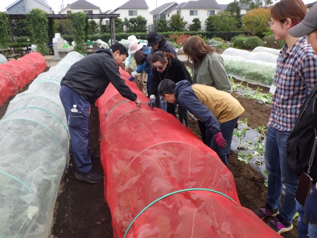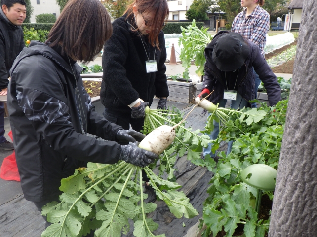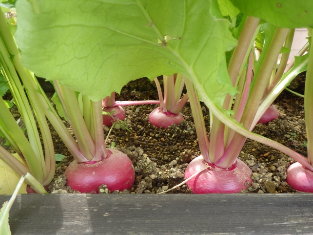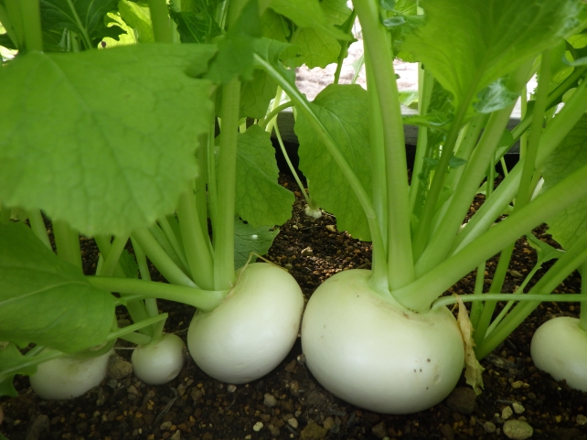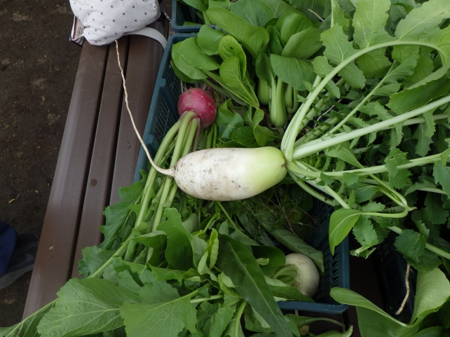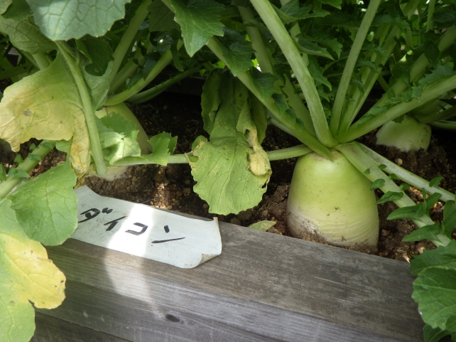 カブやチンゲンサイはすっかり収穫サイズに育ち、ダイコンも土からニョキっと顔を出しています。