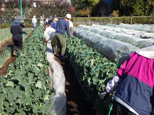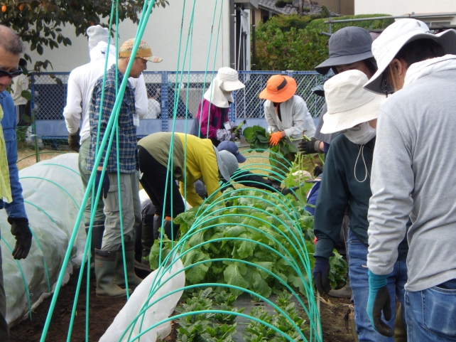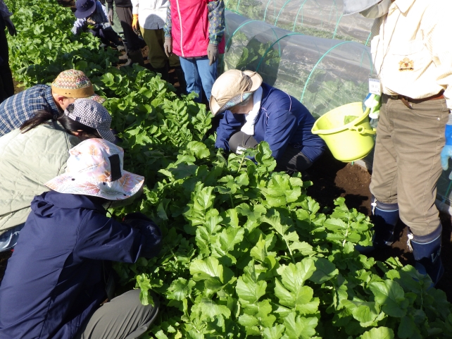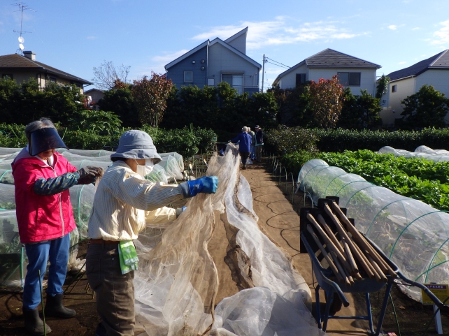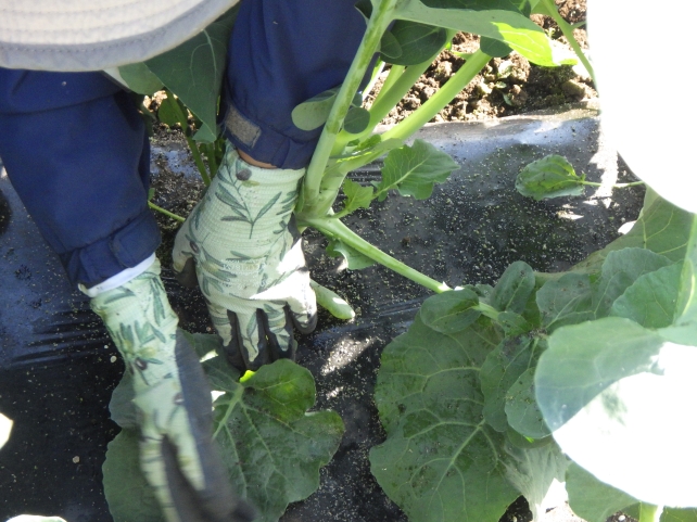 茎ブロッコリーやダイコンの葉が大きく育ち、防虫ネットが窮屈になってきました。同時にアブラムシが出始めたので、今日はネットを外しました。外したネットや資材は決められた方法で畳んだり束ねたり。みなさんかなり資材の扱いも慣れ、お互いの息も合ってきたので、スムーズに作業は進みました。
