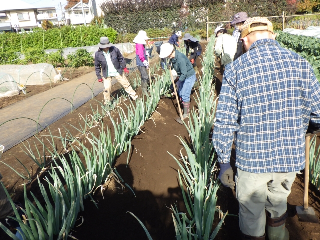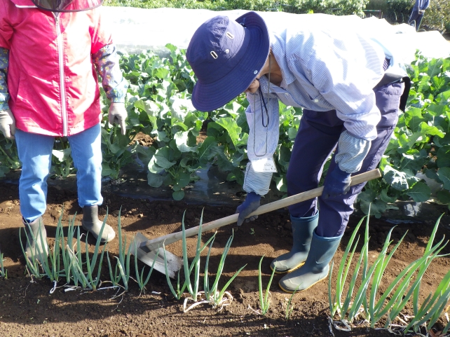 続いてネギの土寄せ。クワで土を掬ってネギの近くに置くのがなかなか難しく、やり方を試行錯誤しながら、少しずつ上手に土を寄せられるようになりました。コツをつかんだ人が苦戦している人に教えてあげたりとほほえましい光景が今回も見られ、受講生同士のコミュニケーションもどんどん深まっているようです。