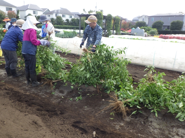 5か月位収穫し続けたピーマンもいよいよ片付け。これも組んである支柱を分解したりまとめたり、残った実を収穫したり、株を抜いたりと、自然と役割分担をしながら、あっという間に圃場はきれいになりました。