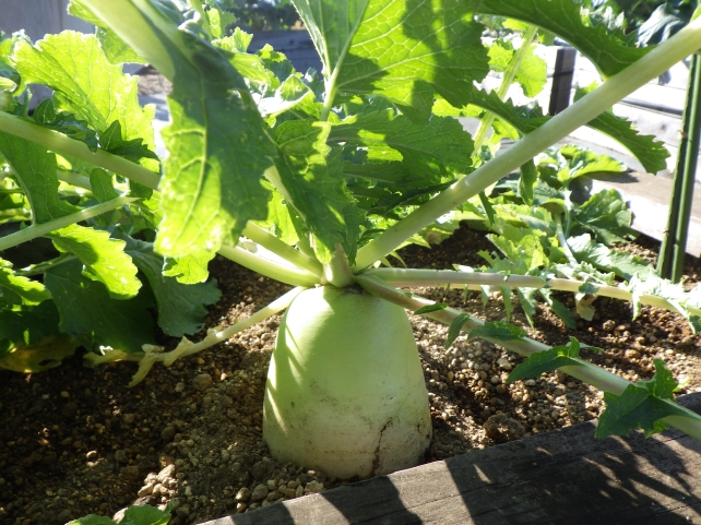 カブやダイコンは2回目の収穫です。前回はまだ小さかったものが、とても立派になっていました。アブラムシがつくこともなく、間引き収穫がとても上手にいきました。大きく育ったものから人数分のカブを収穫し、小さいものは次回の最終回で収穫します。