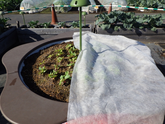 丸型のプランターでは、不織布をかけた場所と掛けていない場所で、作物の育ちがどのぐらい変わるのかを確認しました。薄い生地の不織布ですが、11月前後からの栽培は不織布を1枚掛けるだけで生育がよくなります。