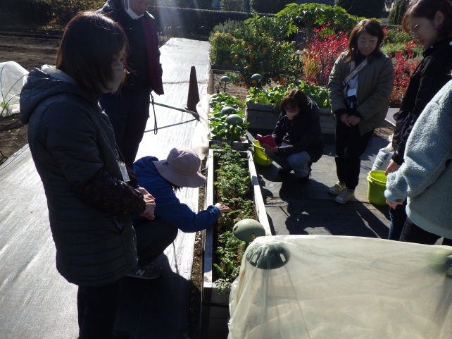 皆でプランターを1箱づつみながら、野菜の育ち具合を確認していきます。