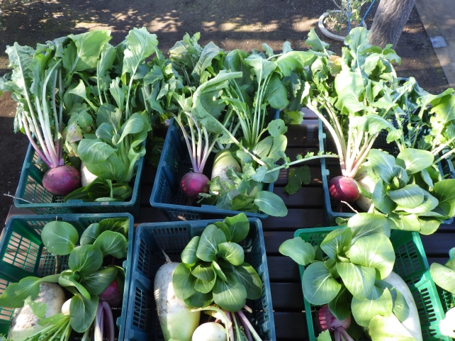 本日も収穫した野菜の宝分けをして終了です。カブは前回と比較して甘味が増していることと思います。新鮮なうちにどうぞ。