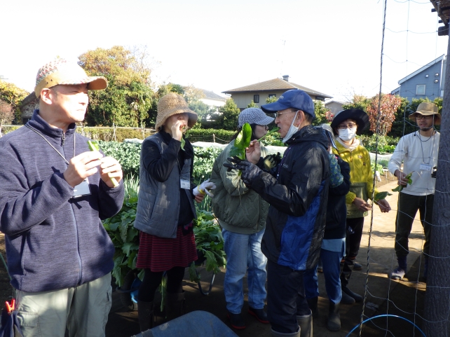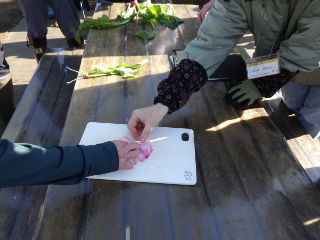 この講座ではあまり店頭ではみかけないような種類の野菜も栽培しているので、家に持って帰って美味しく食べてもらえるように、食べ方の説明をすることもあります。今日は珍しいピンク色のカブを収穫したので、独特の皮のむき方を実演したあと、薄くスライスしたものを実際に試食していただきました。生で食べられるサラダホウレンソウも葉っぱをパクリ。すっかり顔なじみになった受講生同士でも食べ方の情報交換などが盛んに行われていました。