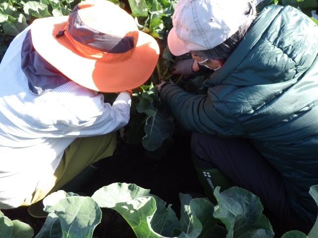 次はスティックセニョールという茎を楽しむ茎ブロッコリーのお世話です。ブロッコリーと違って、冬の間長く楽しめるため、家庭菜園におススメという話を聞いたあと、一番初めに育った小さなブロッコリーみたいな花蕾をカットしていきました。もちろんこれも食べることができます。