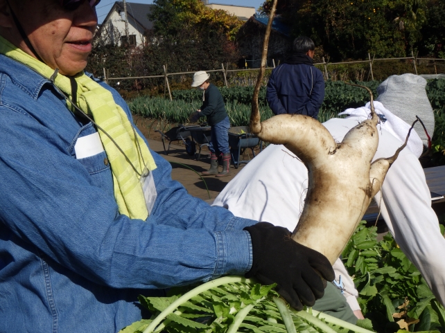 なかなか抜けない人を手伝ってあげたり、それぞれ抜いたダイコンを見せ合ったりと、和気あいあいな雰囲気のまま、畑をきれいに片づけて、本日の講座は終了。次の講座も収穫が続きます。