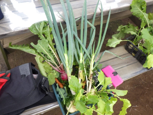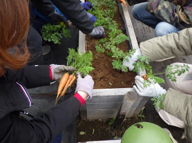 前回から引き続きの紅白のカブや、チンゲンサイを収穫し、最終回に楽しみにしていたニンジンと長ネギ、ハツカダイコン、コマツナを収穫しました。