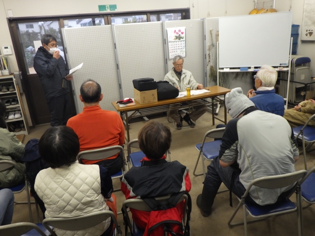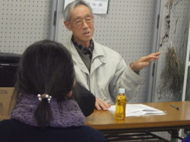 まずは座学からスタート。4月から講座に来園し、定期的に栽培のアドバイスをいただいている特任アドバイザーの鈴木さんにお話しをしていただきました。いつもは畑で作業をしながら鈴木さんにアドバイスや実演をしていただいていますが、冷たい雨が降っている今日みたいな日は、改めて鈴木さんが行ってきた有機農業についての話しを聞くのに良い機会となりました。