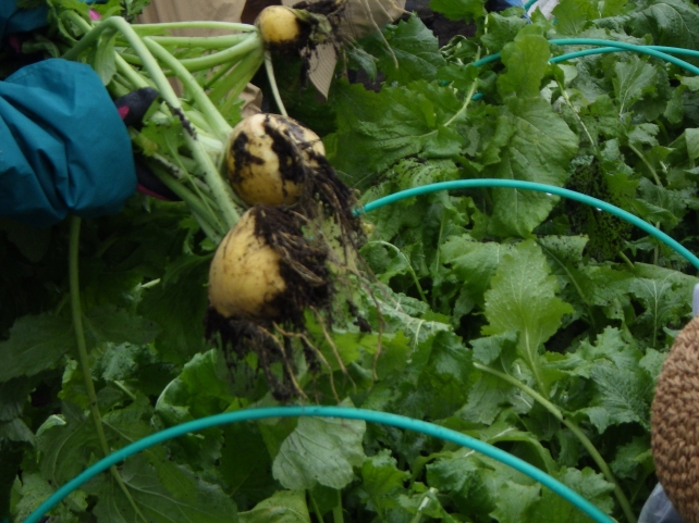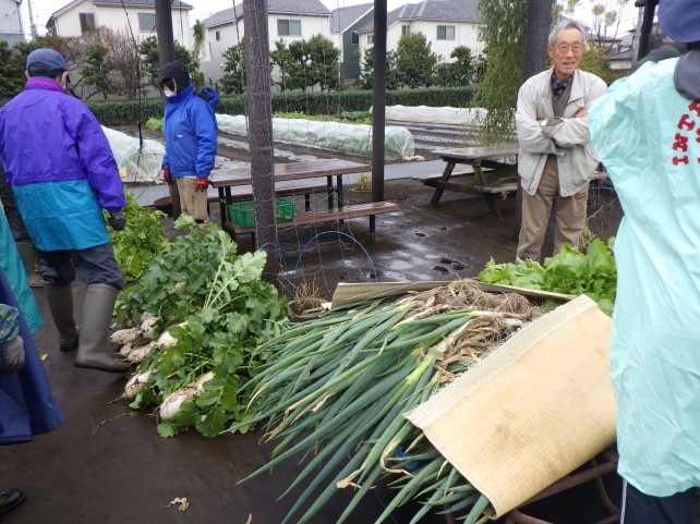 少し雨も小降りになったので、講義の後は畑に出て野菜を収穫しました。年内最後の講座ということで、畑には収穫待ったなしの野菜が山盛り。