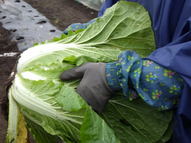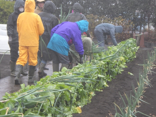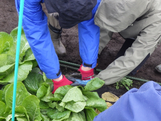 まだ雨が少し残りかなりの寒さでしたが、野菜の収穫となるとみなさん笑顔になり、手際よく手分けして収穫にあたっていました。
