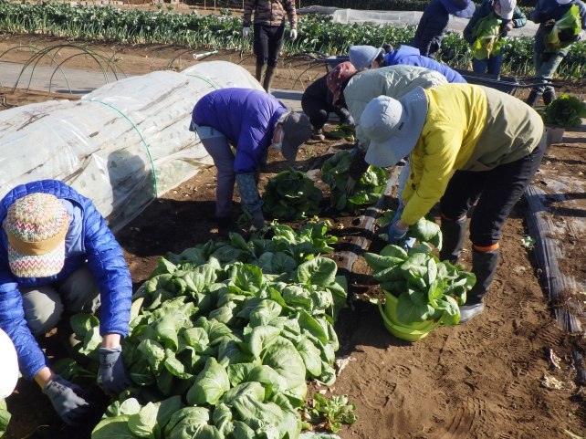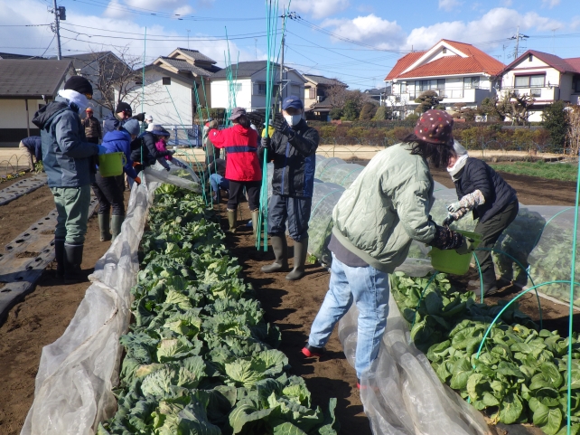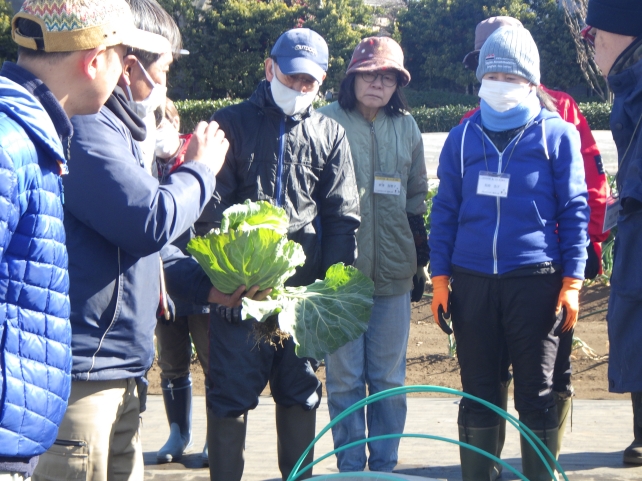 部屋で温まった後は、外での作業。今朝は水桶に厚い氷が張るくらい寒かったので、みなさん防寒対策はバッチリです。今日のメインは収穫と片付け。今回初めて収穫する野菜であるキャベツの説明を聞いてから、一斉に作業をスタートしました。