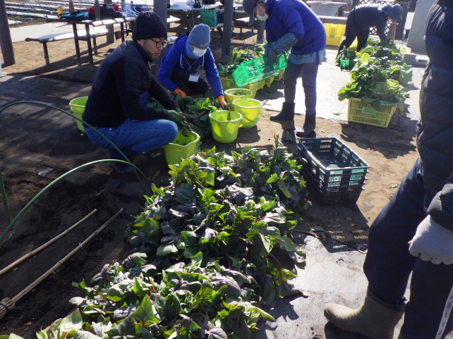 1年近く作業をともにしているので、収穫する人、持って帰りやすいように処理をする人、分ける人、片づける人など、手分けして自発的にどんどん作業を進めていきます。キャベツに続いて前回も収穫したハクサイや葉物も収穫しましたが、中には小さいままの野菜も。作業の合間にうまく育たなかった野菜を観察したり説明を聞いたりすることで、野菜栽培の楽しさだけでなく難しさや農家の方の大変さも改めて感じていただけたのではないでしょうか。