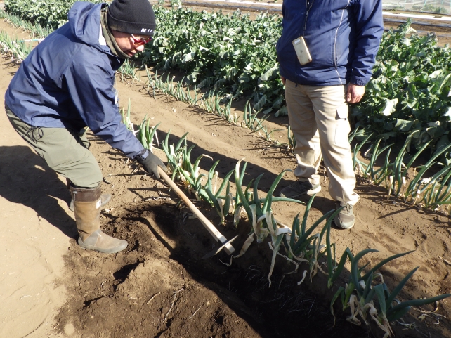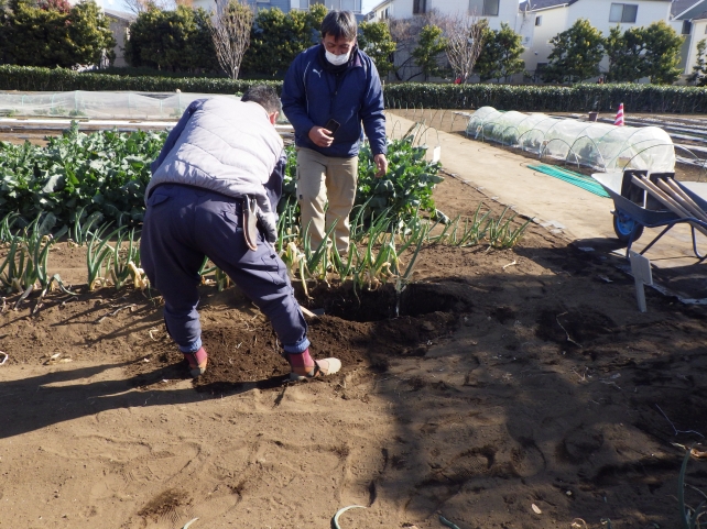 今日は杉並区の農家さんにも来ていただいたので、ネギの収穫の仕方を教わりました。クワを器用に使って、ネギを傷つけないギリギリのところを掘っていくその技に、みなさん改めて感心。その後、実際にやってその難しさを実感しつつ、みんなで工夫しながら、大事にネギを収穫していきました。